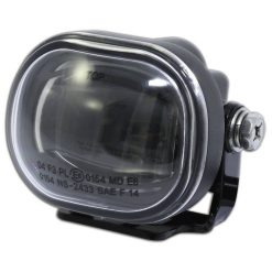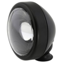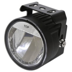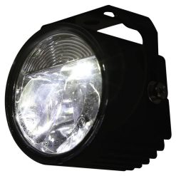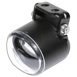 Kleiner, leistungsstarker Abblendscheinwerfer mit 1 Power-LED (8 Watt) in einem matt-schwarzen Aluminium-Gehäuse mit runder Linse, eingefasst in eine stabile Halterung aus Stahl. Die LED-Technik und der verwendete Einsatz erzeugen ein symmetrisches, helles Licht für eine optimale Wahrnehmung von Bikern durch andere Verkehrsteilnehmer, E-geprüft.