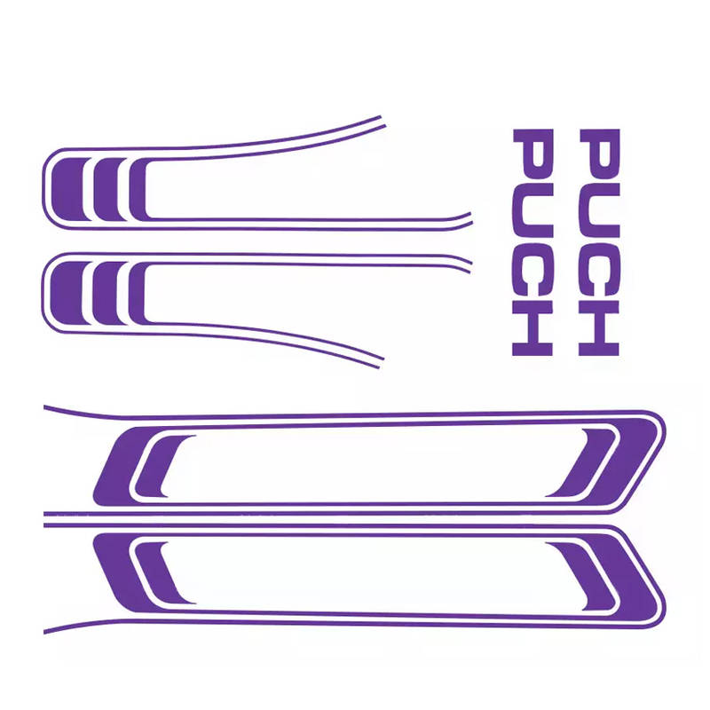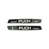 Der Aufklebersatz enthält die beiden Schriftzüge «PUCH» sowie die Dekor-Aufkleber für den Tank und hinteren Rahmenteil.