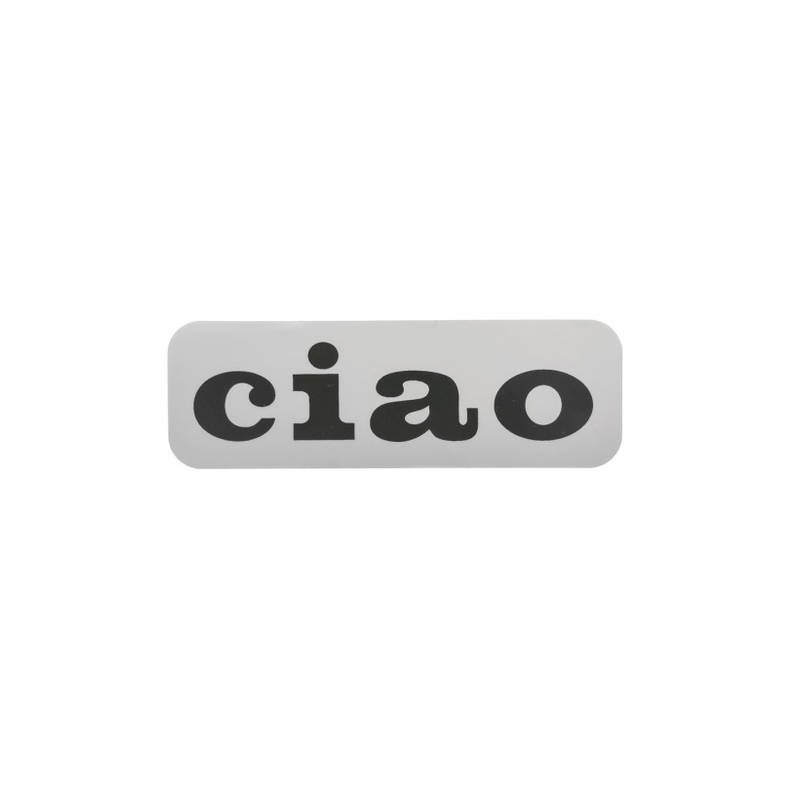 Ciao Kleber mit schwarzer Schrift auf grauem Untergrund. Wird bei älteren Piaggio Ciao Mofas seitlich am Tank angebracht.