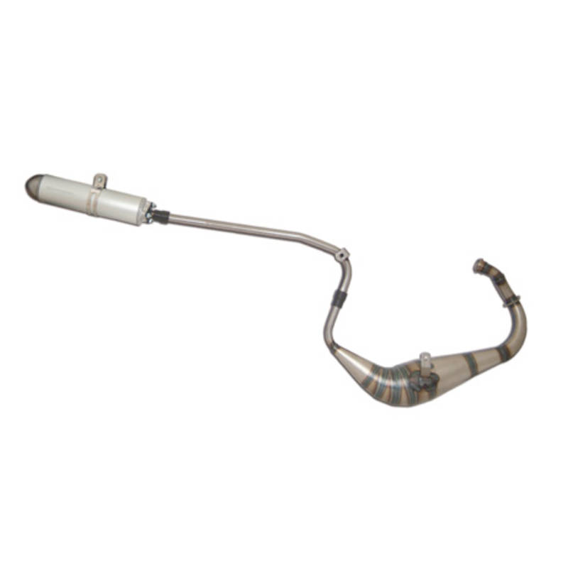 Handgeschweisste Rennauspuffanlage mit transparenter, hitzefester Speziallackierung für Zylinder von 50 bis 70ccm und Vergaser bis 21mm. Für mehr Beschleunigung und verbesserte Leistung in hohen Drehzahlen. Wahlweise mit Alu- oder Carbonschalldämpfer.