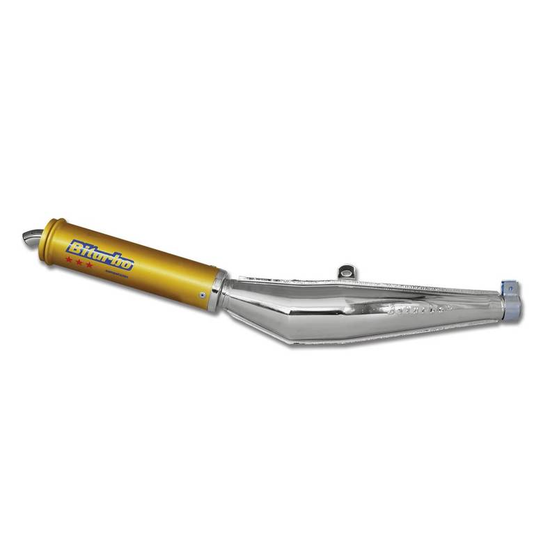 Auspuffendtopf Biturbo verchromt mit goldig eloxiertem Aludämpfer. Universell verwendbar – für alle Krümmer mit 28mm Aussendurchmesser.