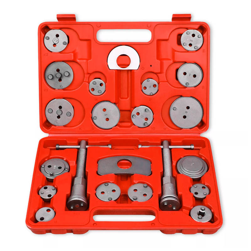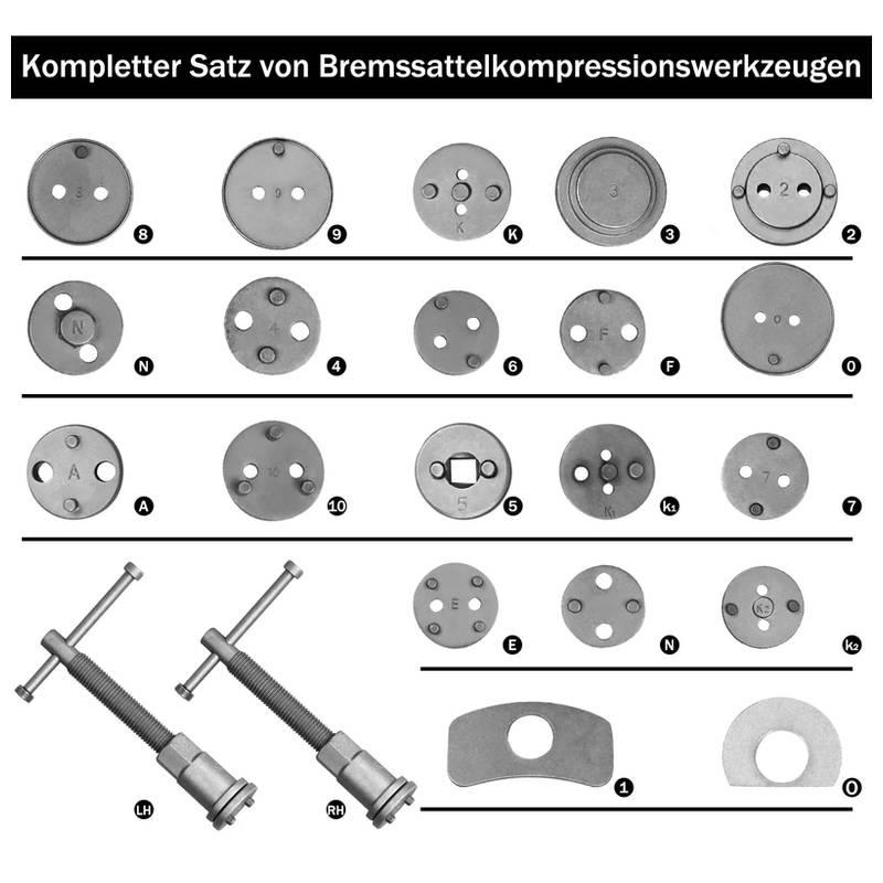 18-Teiliges Rückstellwerkzeug für Fahrzeuge mit Faustkolbenbremssattel.