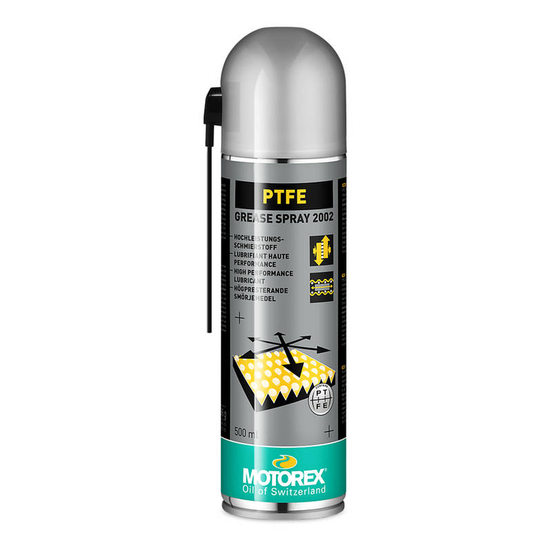 Der MOTOREX PTFE GREASE SPRAY 2002 vereint die Eigenschaften eines Fettsprays mit denen des Trockenschmierstoffes PTFE. Die mikronisierten PTFE Partikel bieten hervorragende Notlaufeigenschaften. Die hochwertige Kombination aus Fettspray und PTFE bieten einen sehr niedrigen Reibungskoeffizienten und extrem lange Schmierwirkung. Dank sehr guter Haftfähigkeit und Walkbeständigkeit wird der Stick Slip-Effekt gänzlich vermieden und ist hoch Wasserbeständig.