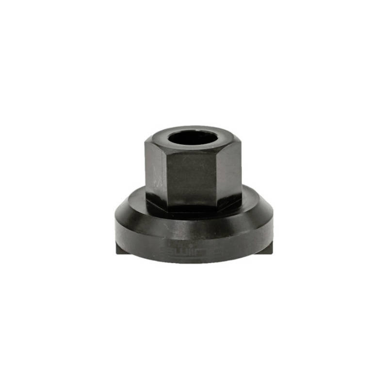 Das Werkzeug wird über die Radachse geschoben und die beiden Nocken in die Nut im Freilauf gesetzt. Nun wird die Radmutter auf die Radachse gedreht, sodass das Werkzeug gegen den Freilauf gedrückt wird.