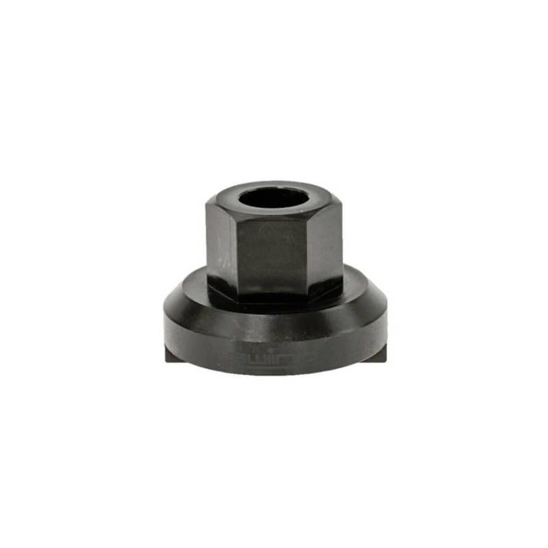 Das Werkzeug wird über die Radachse geschoben und die beiden Nocken in die Nut im Freilauf gesetzt. Nun wird die Radmutter auf die Radachse gedreht, sodass das Werkzeug gegen den Freilauf gedrückt wird.