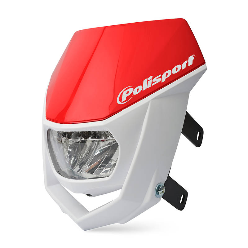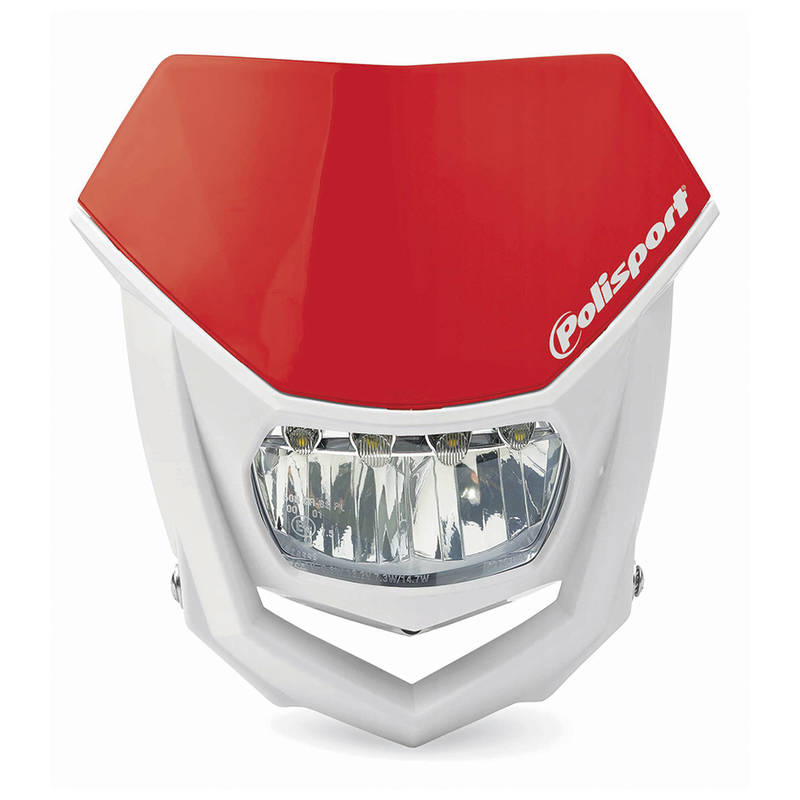 C.E.-Geprüfte LED Scheinwerfermaske mit Standlicht, Abblendlicht und Fernlicht für Cross- und Supermoto-Motorräder. Erhältlich in den markentypischen Farben.