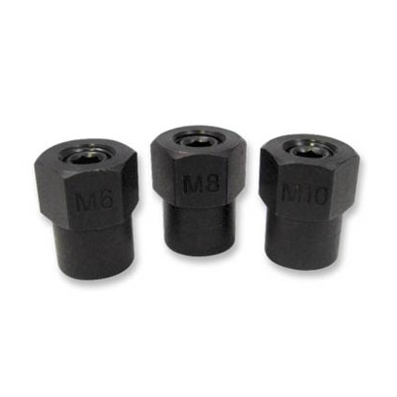 Praktisches Werkzeug-Set (3 Stück) zur Montage/Demontage von Gewindebolzen. Im Innern dient ein Kugelkopf als Anschlag für den Gewindebolzen , welcher das Beschädigen des Gewindes wirkungsvoll verhindert. Die Werkzeuge sind mit einem 19mm Aussensechskant versehen, zum Kontern dient eine 6mm-Inbus-Schraube.