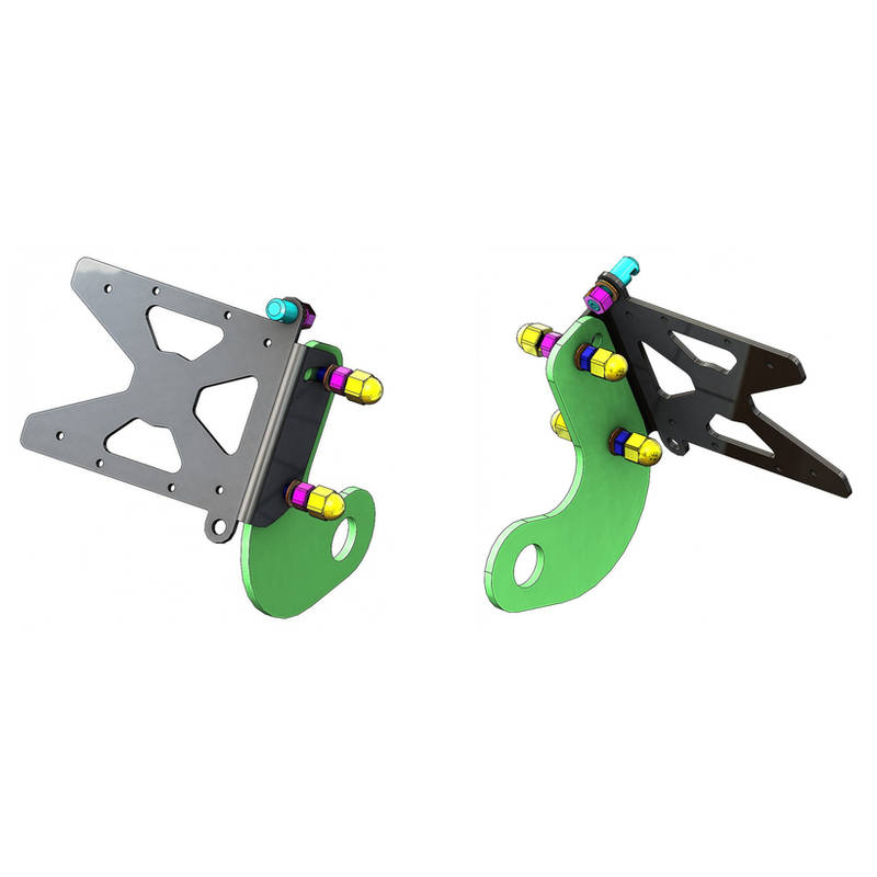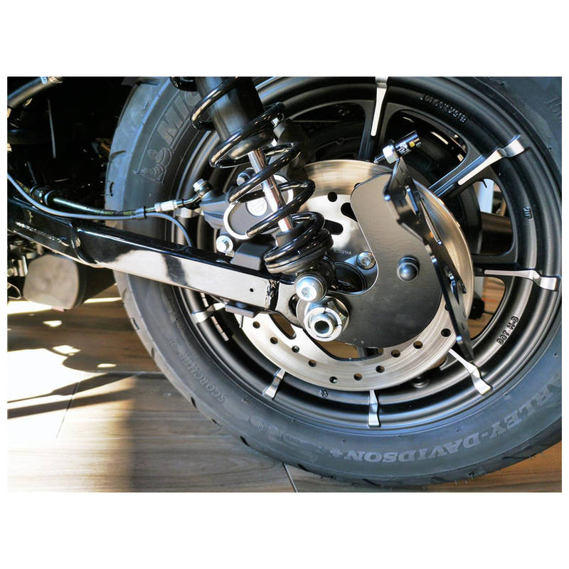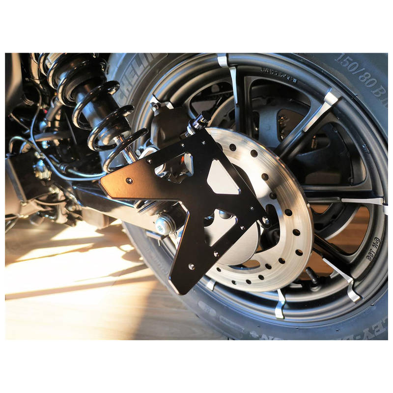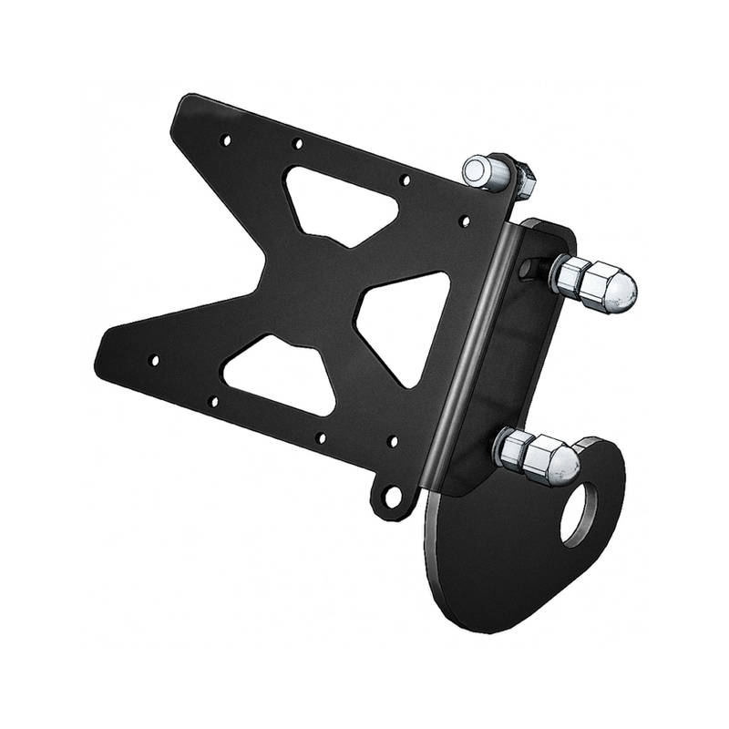 Hochwertiger, verstellbarer Kennzeichenhalter aus pulverbeschichtetem Stahl zur seitlichen Befestigung an der Schwinge (Radachse) links oder rechts, inklusive LED-Kennzeichenbeleuchtung.
