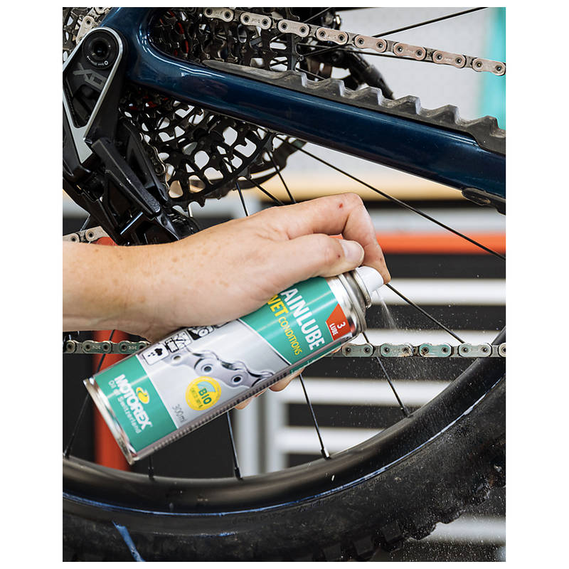 MOTOREX CHAINLUBE FOR WET CONDITIONS wird empfohlen für die Schmierung von Fahrradkette und Wechsler bei überwiegend feuchten oder nassen Bedingungen.
