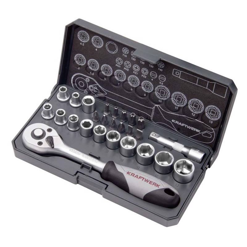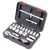 Steckschlüsselsatz 26-teiliger mit Ratsche, Verlängerung, Stecknüssen und diversen Bit-Einsätzen in einer stabilen Kunststoffbox. Praktisch für Unterwegs.
