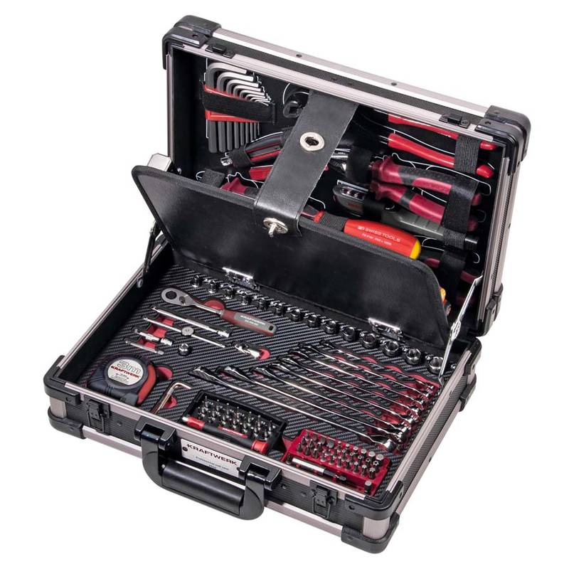 Im Lieferumfang enthalten sind diverse Universal-Messer, Zangen, Schraubendreher, Hammer, Rollbandmass, ein Satz Ring-Maulschlüssel, ein Steckschlüssel mit 1/4″ Stecknüssen, Verlängerungen, Adapter, Bit-Box etc.
