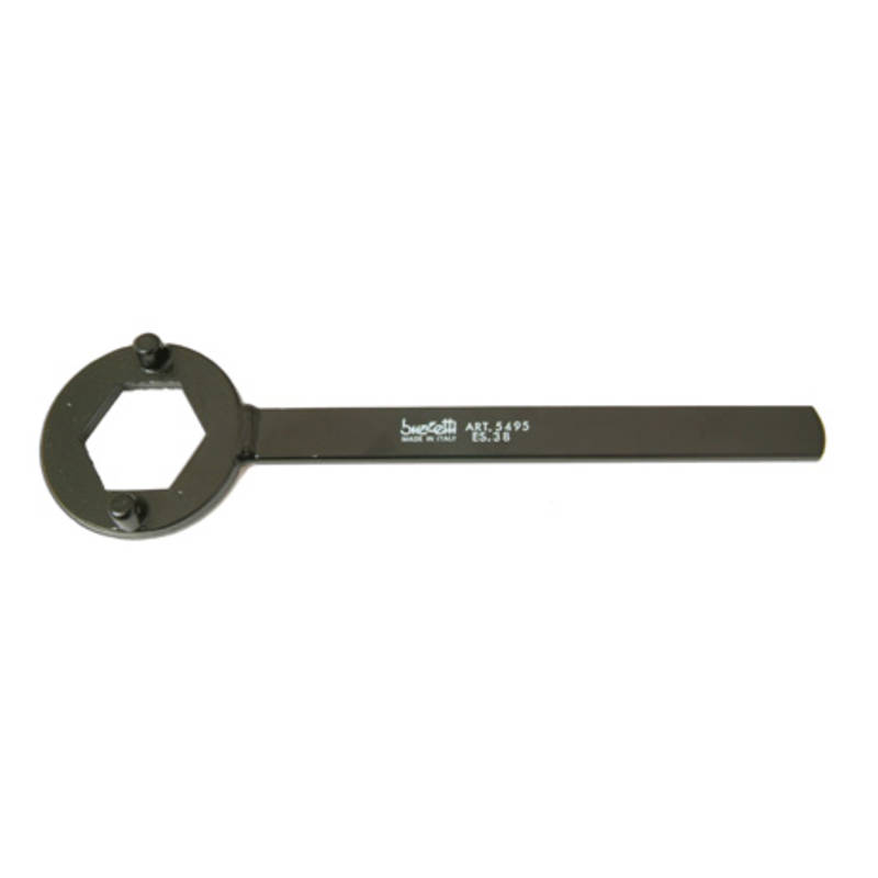 Die Kupplungshalter von Buzzetti sind zwei Werkzeuge in einem. Die Zapfen greifen in die Kupplungsglocke, dadurch läßt sich die Glocke einfach blockieren und die Mutter öffnen. Zum zweiten läßt sich mit dem Schlüssel die große Mutter der Kupplung entfernen.