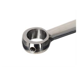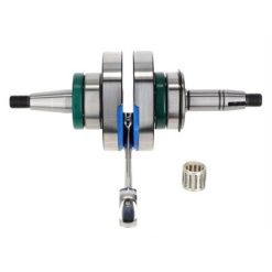 Mit Kunststoffeinsätzen gepaddete Vollwangen Kurbelwelle. In der AKOA Pro Race 2 Welle kommt der polierte und verstärkte Messerpleuel mit extra dickem Pleuelauge und doppelter Schmierkerbe am hinteren und vorderen Auge zum Einsatz.