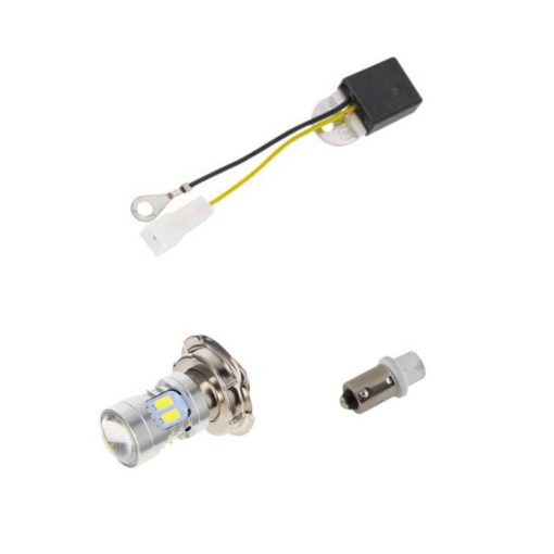 Umrüstkit auf 6V LED, besteht aus Scheinwerfer Birne P26s/BA9s und Spannungsregler.