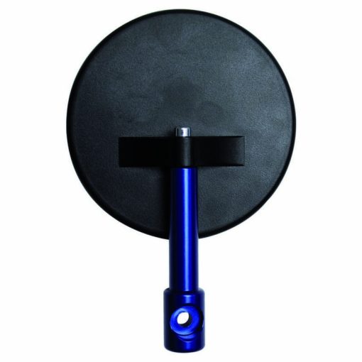 Schwarzer, runder Spiegel mit konvexem Glas (2.5mm), geradem und kurzem Arm in Blau.