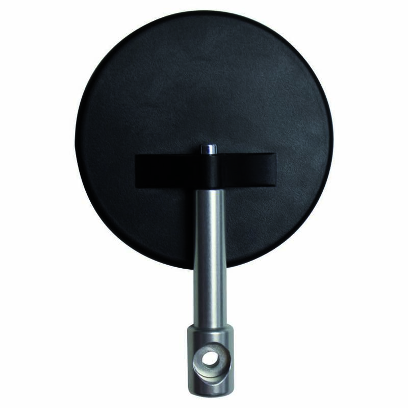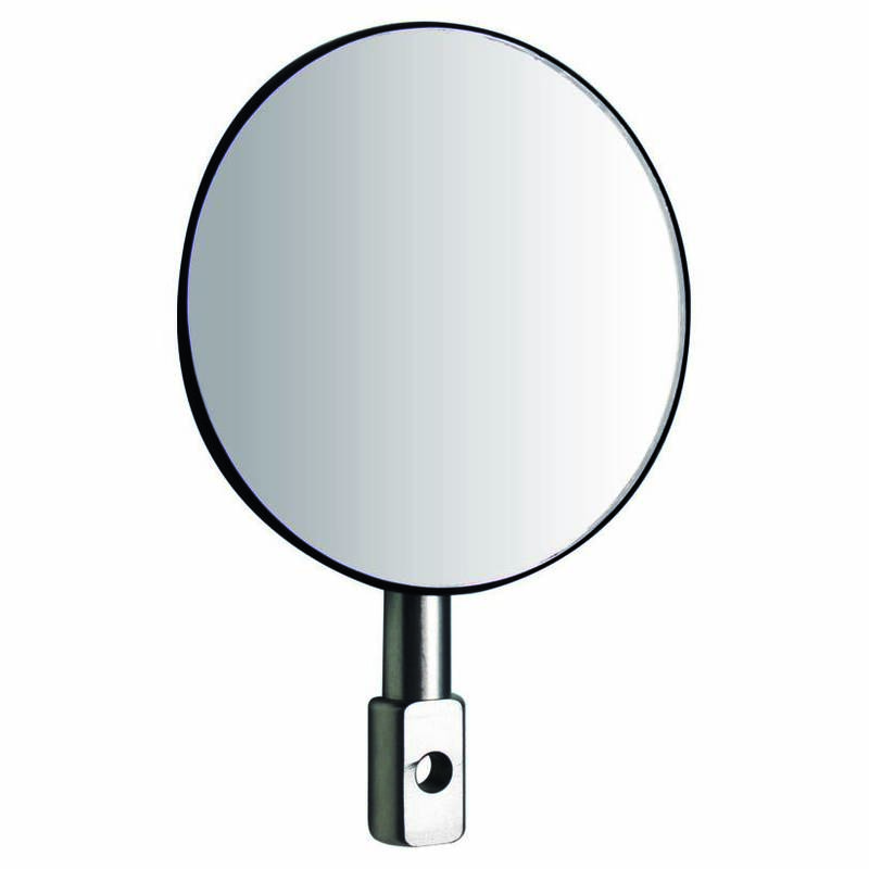 Schwarzer, runder Spiegel mit konvexem Glas (2.5mm), geradem und kurzem Arm in Silber.