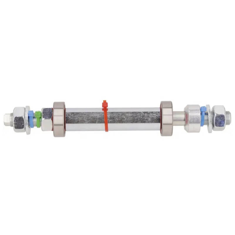 Die Hinterrad-Achse enthält alle benötigten Scheiben, Muttern und Distanzbüchsen.