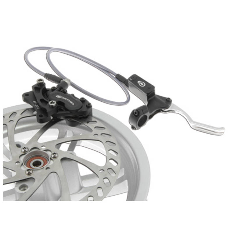 Wenn du ein Beschleunigungsjunkie bist und auch noch das letzte Quäntchen Leistung aus deinem Projekt herausholen willst, kommst du um die Drag-Felge, wie sie auch im bekannten KIKAKU-Sprinter verbaut ist, nicht herum. Das bauartbedingte geringe Gewicht und die vorbereitete Aufnahme für Fahrradbremsscheiben bieten die optimale Voraussetzung für das Nonplusultra deines Sprinters. Passend zu der Felge bieten wir mit dem Drag-Race-Bremskit eine wesentlich leichtere Alternative zu den serienmäßigen Rollerbremssystemen. Die 6-Kolben-Bremszange in Verbindung mit der 203mm-großen Bremsscheibe bringt euren Scoot somit wieder schnell zum Stehen. Bitte beachtet, dass das Bremssystem rein für Rennsportveranstaltungen wie die des DSSC verwendet werden darf und im Straßenverkehr NICHT zulässig ist! Die Bremsscheibe kann ohne großen Aufwand mit drei Inbusschrauben auf die 10″ Drag-Race-Felge montiert werden.