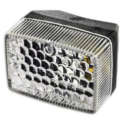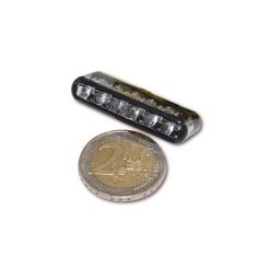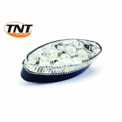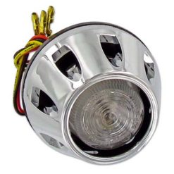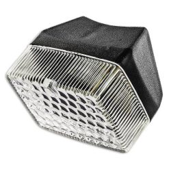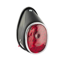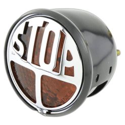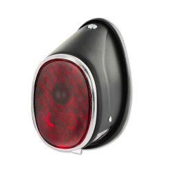 Rücklicht mit einer Power-LED und klarem Glas, eingebettet in ein schwarzes, rundes Aluminium-Gehäuse, E-geprüft.
