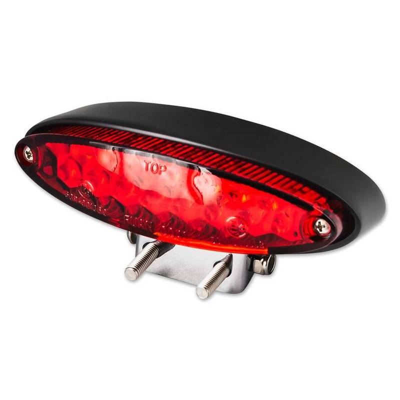 Modernes mini LED-Rücklicht mit einem robusten Metallgehäuse in schwarz inkl. Bremslichtfunktion und Nummernschildbeleuchtung, rotes Glas, E-geprüft.