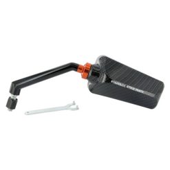 Die Styling-Abteilung von Stage6 hat sich die beliebten F1-Spiegel vorgenommen, die von vielen Herstellern seit Jahren unverändert angeboten werden, und ihnen ein ordentliches Redesign und Qualitätsupgrade verpasst. Die Einstellung erfolgt über ein großes Kugelgelenk, das sich in einem weiten Bereich justieren lässt. Die Spiegelarme aus Metall wurden recht kurz gehalten, um auch den optischen Aspekt nicht aus den Augen zu verlieren. Fixiert wird der Spiegel über die orange eloxierte Feststellmutter; ein spezielles Tool ist im Lieferumfang enthalten. Ausgeliefert werden die Spiegel mit einem kurzen M8-Gewinde; ein Adapter für durchgebohrte Spiegelaufnahmen.