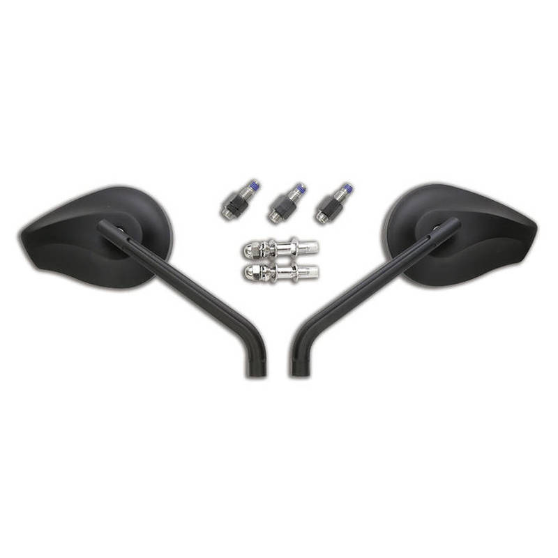 Schwarz-eloxierter Aluminium- Rückspiegel HIGHSIDER PHOENIX 1mit einem oval geschnittenen Kopf und geknicktem Arm. Inkl. 2x Spiegeladapter für Harley-Davidson-Modelle sowie 2x M10x1.25mm Rechtsgewinde- und zusätzlich 1x extra Linksgewinde- Adapter für YAMAHA, Paar, E-geprüft