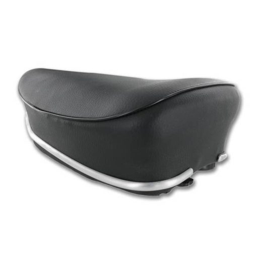 Der klassische Puch Maxi Sattel mit Feder-Grundplatte, Wekzeugbox und einer Alu-Zierleiste.
