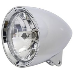 H4-Halogen-Hauptscheinwerfer mit einem hochwertig verarbeiteten, schwarzen Aluminium-Gehäuse. Der Scheinwerfer verfügt über einen asymmetrischen – nur für den Rechtsverkehr zugelassenen – Prismenreflektor und Standlicht, E-geprüft.