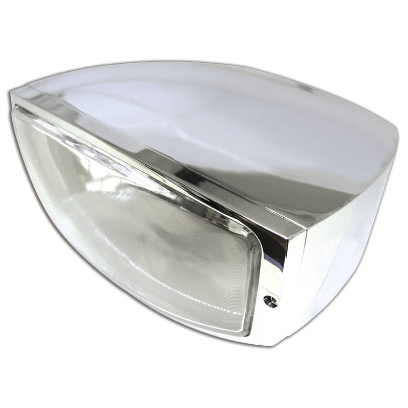 H4-Halogen-Hauptscheinwerfer inklusive Standlicht und einem verchromten Metall-Gehäuse. Der Reflektor strahlt ein helles, symmetrisches Licht aus – für eine gute Fahrbahnausleuchtung und optimale Sicht. Der trapezförmige Scheinwerfer besticht durch seine weiche, gebogene Linienführung und dem edlen Hochglanzgehäuse, E-geprüft.
