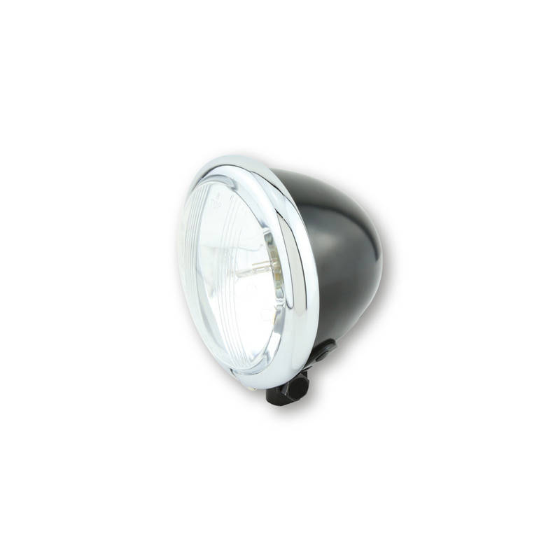 SHIN YO 4 1/2 Zoll Scheinwerfer BATES STYLE, geprägtes Glas, BA20D, mit Fern-, Abblend- und Standlicht, schwarzes Metallgehäuse, Chromring, Befestigung unten, E-geprüft.
