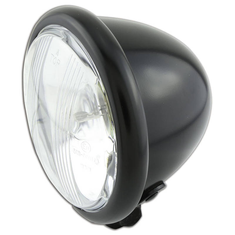 SHIN YO 4 1/2 Zoll Scheinwerfer BATES STYLE, geprägtes Glas, BA20D, mit Fern-, Abblend- und Standlicht, schwarz seidenmattes Metallgehäuse, Befestigung unten, E-geprüft.