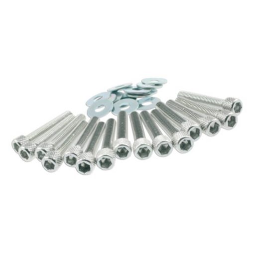 STR8-Motordeckeldekoschrauben für Minarelli-Motoren. Die Schrauben sind aus Aluminium und sollten nur zur reinen Showzwecken verwendet werden. Die schwarz lackierten hingegen können ohne Probleme als Ersatz für Originalschrauben verwendet werden.