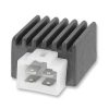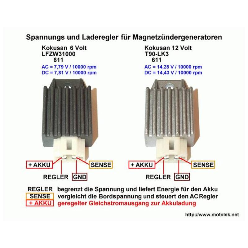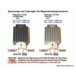 Diese Spannungsregler-Gleichrichter-Einheit Kokusan T90-LK3 611 begrenzt die Spannung zuverlässig auf 14.28 AC bzw. 14.43 Volt DC und richtet den Strom gleich. Die Lebensdauer der Glühlampen wird deutlich erhöht, zudem kann eine 12 Volt Batterie optimal geladen werden.