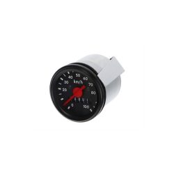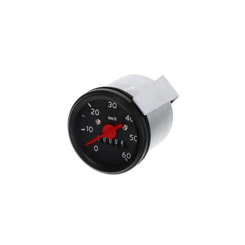 VDO Nachbau Tachometer mit Anzeige bis 60 km/h, Zifferblatt schwarz. Mit M10x1 Anschluss, passend für Tachohalterungen, Lampen, Scheinwerfer mit 48 mm Lochdurchmesser. Der Tacho ist mit einem Beleuchtungsschlitz ausgestattet und wird bei Einbau ins Lamepengehäuse direkt mitbeleuchtet.