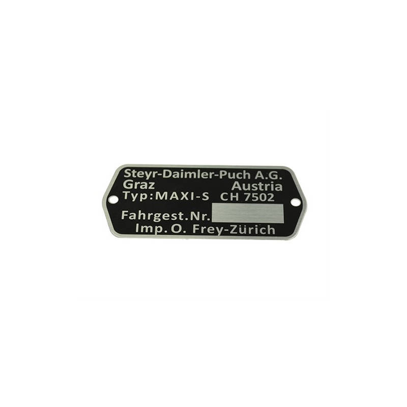 Leeres Puch Maxi S Typenschild, Typ CH 7502. Die Rahmennummer muss/kann selber für das jeweilige Fahrzeug mit Schlagzahlen eingeschlagen werden.