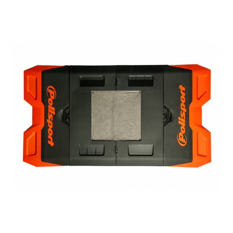 Faltbare, FIM konforme Unterlage für das Motorrad mit integrierter, austauschbarer Öl-Auffangwanne, die bis zu 1 Liter fasst (3 Stück im Lieferumfang enthalten). Aus hochfestem Kunststoff, ohne Werkzeug aufzubauen. Pre-Cut in der Mitte für optimalen Halt des Ständers (passt für alle handelsüblichen MX-Ständer). Mit Ablagen für Werkzeug und Schrauben, einfach zu reinigen.