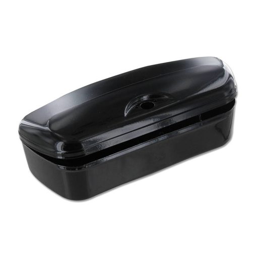 Geräumiger, stabiler Werkzeugbehälter aus Metall in schwarz zum aufklappen. Der Deckel ist vorbereitet für die Montage eines Schlosses.