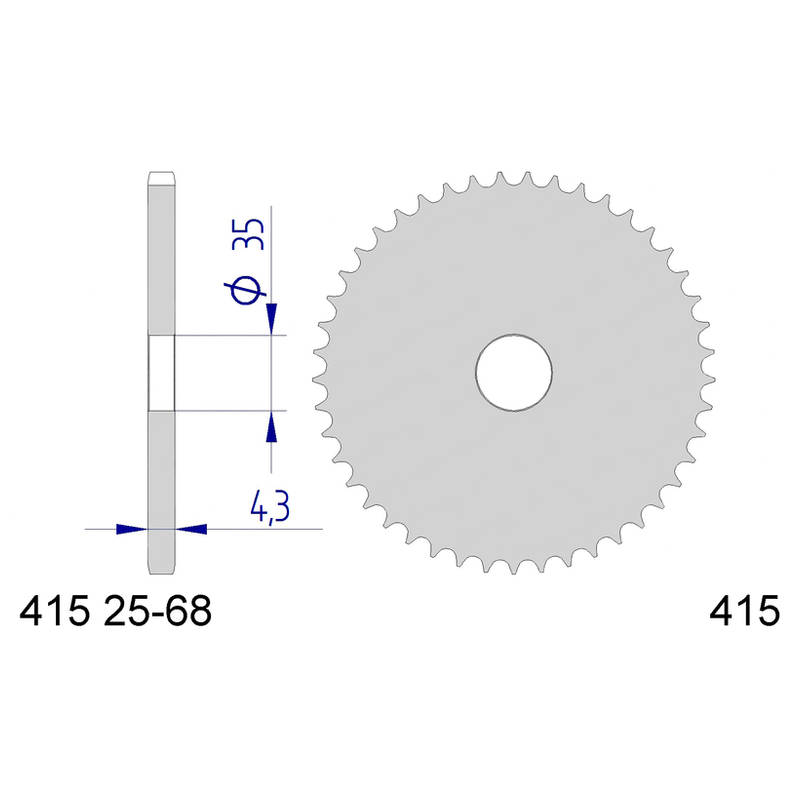 Aluminium-Zahnkranz mit 415er Kettenteilung (Mofa und GP 125). Dieser Zahnkranz muss auf die jeweilige Nabe angepasst werden. Das Loch in der Mitte hat einen Durchmesser von 35mm, was die Anpassung auf nahezu jede Nabe ermöglicht.