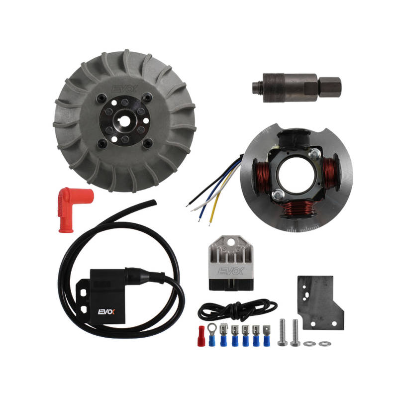 Diese Zündung ist Pickup gesteuert und verfügt über eine variable Zündzeitpunktverstellung. Die deutlich gesteigerte Lichtleistung im Vergleich zu einer alten Zündanlage ist schon bei niedrigen Drehzahlen sichtbar, ebenso ein sauberer Motorrundlauf. Das leichte, gewuchtete Polrad sorgt neben der optimierten Kühlung auch für einen starken Durchzug aus dem unteren Drehzahlbereich. Über den mitgelieferten Spannungsregler wird das Bordnetz stabil mit 12V Gleichstrom versorgt und die Batterie kontrolliert geladen. Ob warm oder kalt, die moderne CDI Steuerung lässt den Motor in jedem Betriebszustand zuverlässig anspringen.